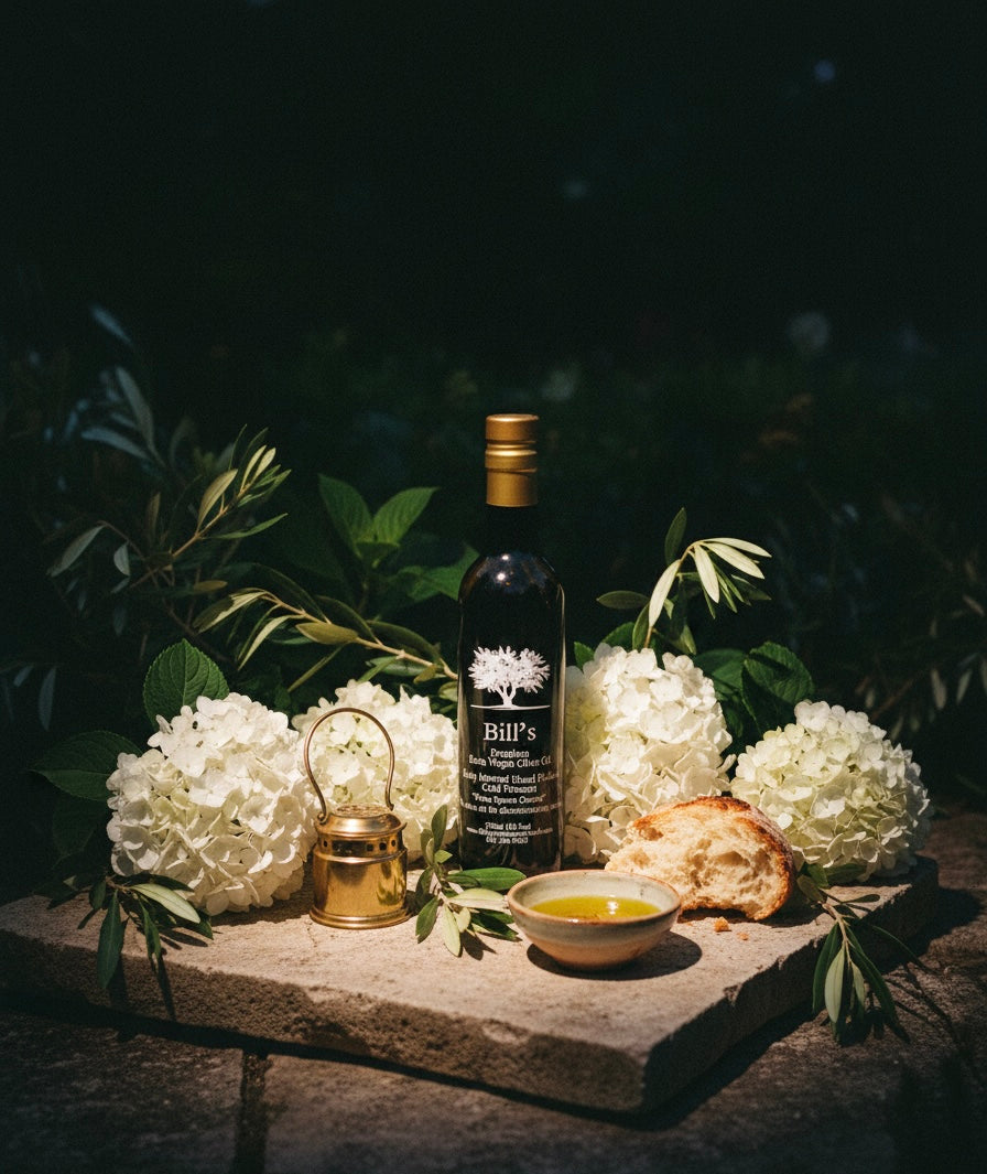 "The secret to extraordinary dishes. Bill's Extra Virgin Olive Oil stands out in taste and tradition."